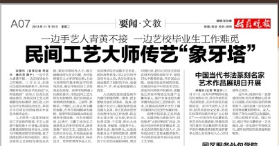 本报讯(首席记者 李龙兴 通讯员 樊宁)一边手艺人青黄不接,一边艺术类毕业生工作难觅。11月14日,在虎丘区政协牵线搭桥下,苏州高博软件技术职业学院启动“大师进校园”活动,5位虎丘区政协委员、传统民间工艺大师被聘为专职教师,他们走上讲坛为学生传授民间技艺,并表示今后将定向招收相关专业艺术类毕业生。