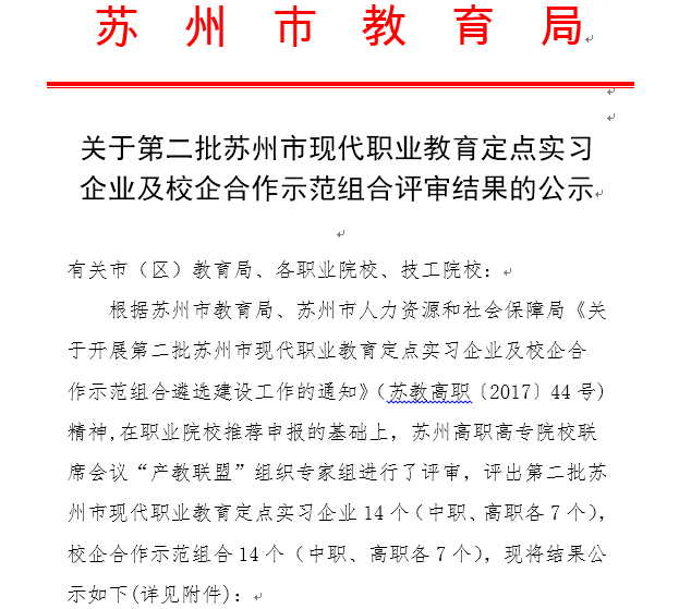 此次荣获“苏州市现代职业教育校企合作示范组合”称号是对我校校企合作工作的认可和鼓励,我校也将继续围绕“为产业办教育”这一办学宗旨,积极拓展校企合作的深度和广度,努力做好示范性工作,助力苏州市现代职业教育的改革发展,为促进职业院校与企业的深度合作,不断创新人才培养模式、提升人才培养质量做出贡献。 (校企合作办)