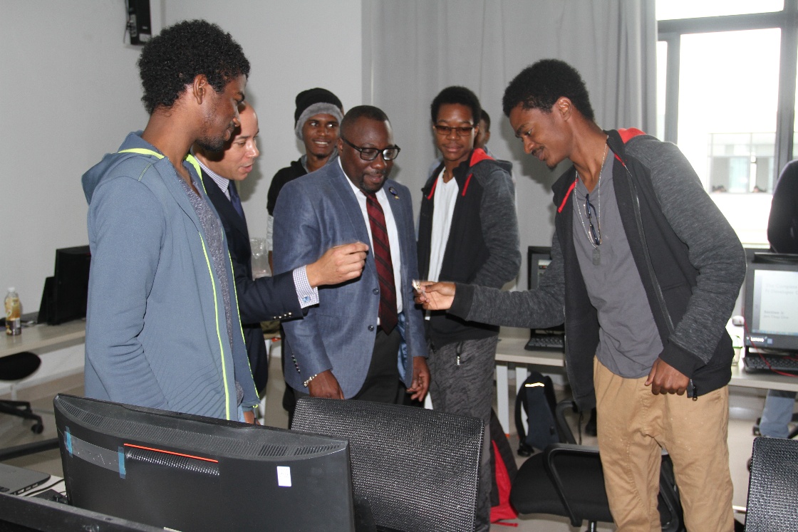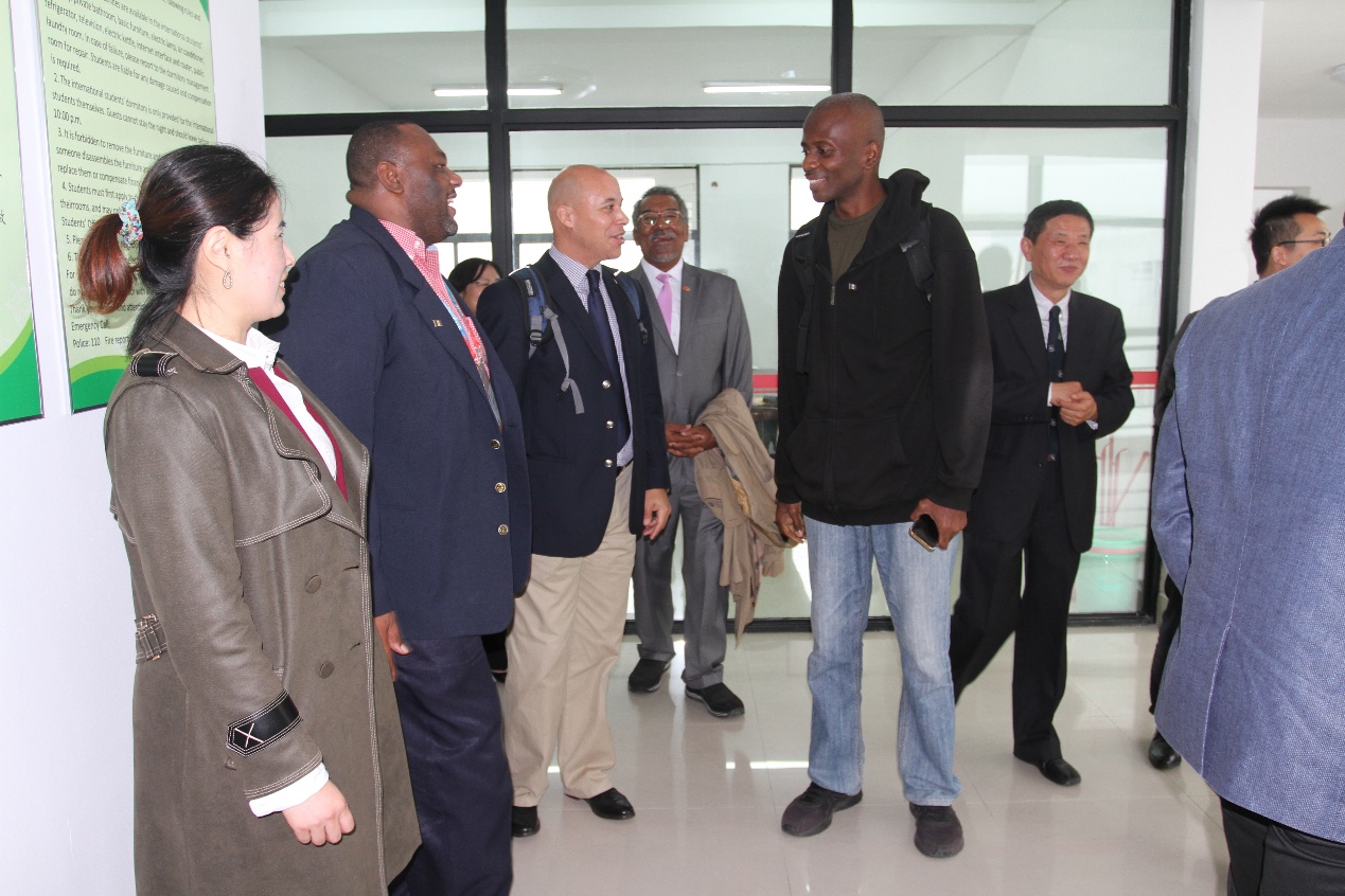 随后,代表团在学校领导的陪同下参观了国际学院的教室。部长先生和大使先生与加勒比地区的学生分享了他们在中国、在高博的感受,勉励学生努力学习,深入了解中国,学好专业知识,将来为中国和加勒比地区的经贸合作做出贡献。代表团一行还饶有兴趣地参观了国际学生公寓,对学生的住宿设施和生活条件给予了高度的评价。