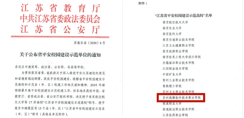 7月2日,江苏省教育厅、江苏省委政法委、江苏省公安厅发布了《关于公布省平安校园建设示范单位的通知》,我校获得“江苏省平安校园建设示范高校”的荣誉称号。