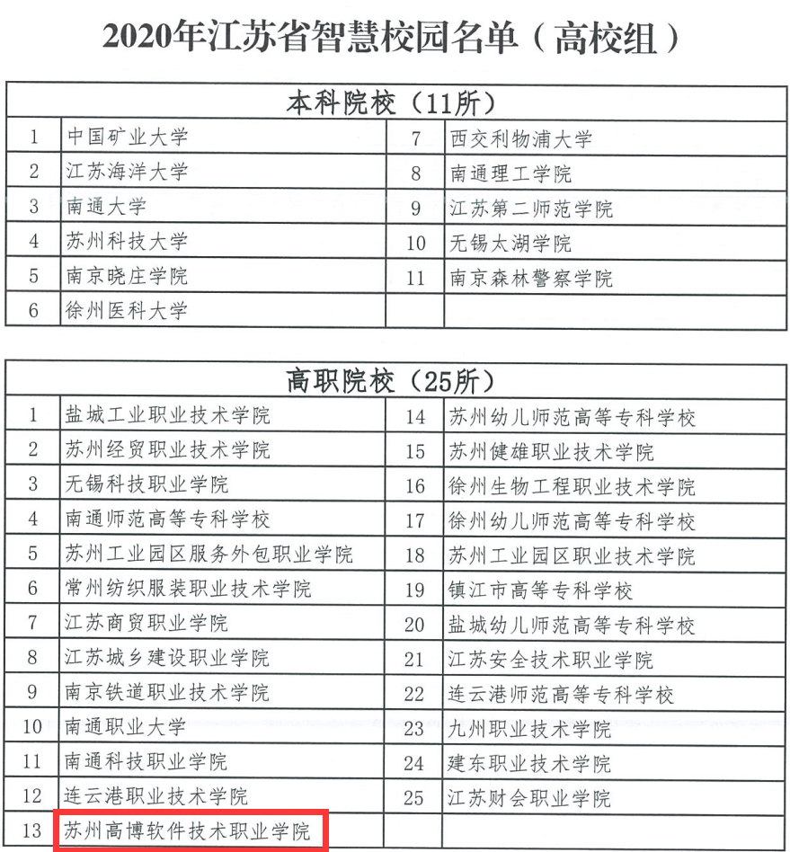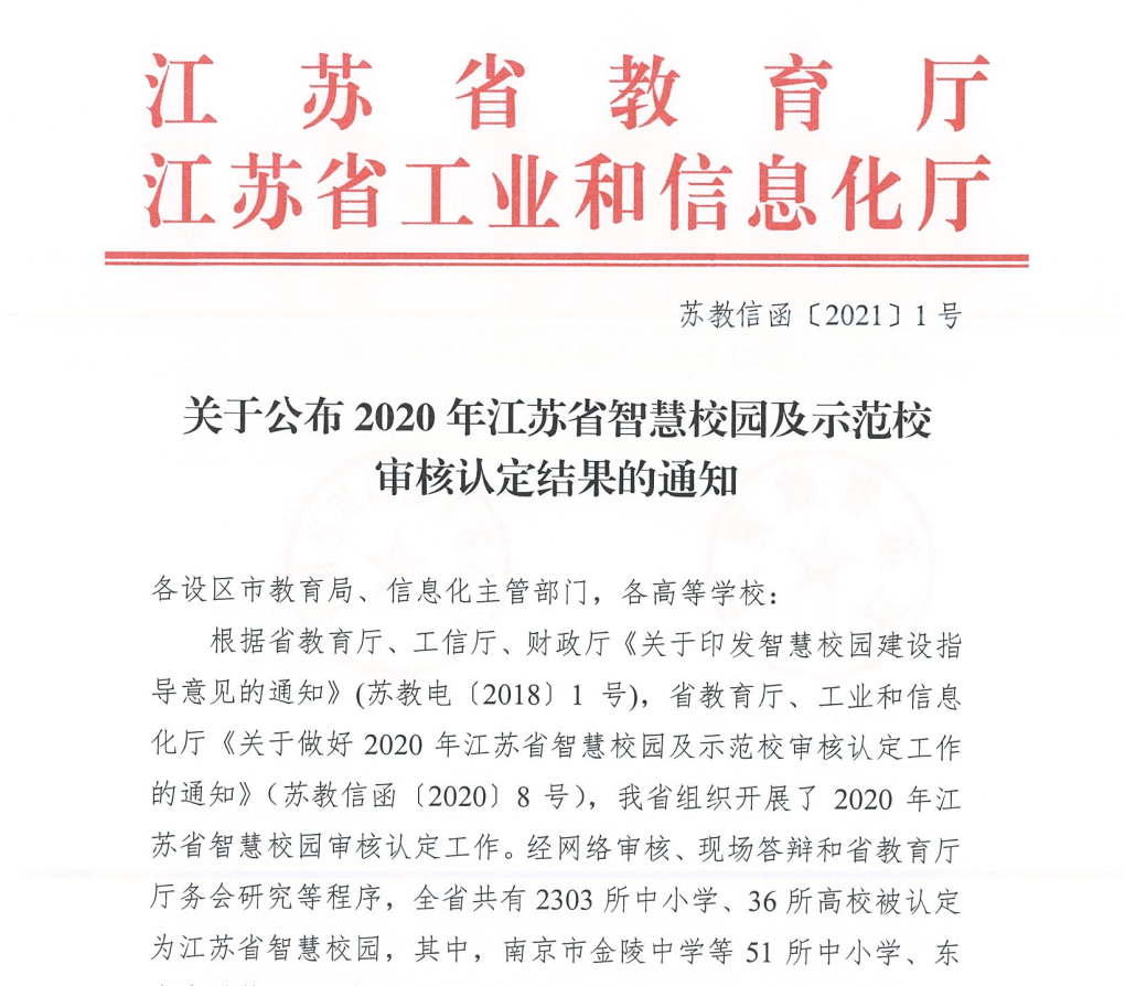 新年伊始,喜讯传来。江苏省教育厅、工业和信息化厅联合发布《关于公布2020年江苏省智慧校园及示范校审核认定结果的通知》(苏教信函【2021】1号),我校被认定为“江苏省智慧校园”。