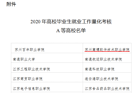 近日,江苏省教育厅下发了关于公布2020年全省高校毕业生就业工作量化考核有关情况的通报(苏教学涵[2021]2号),我校获得了“2020年高校毕业生就业工作量化考核A等高校”的通报表扬。