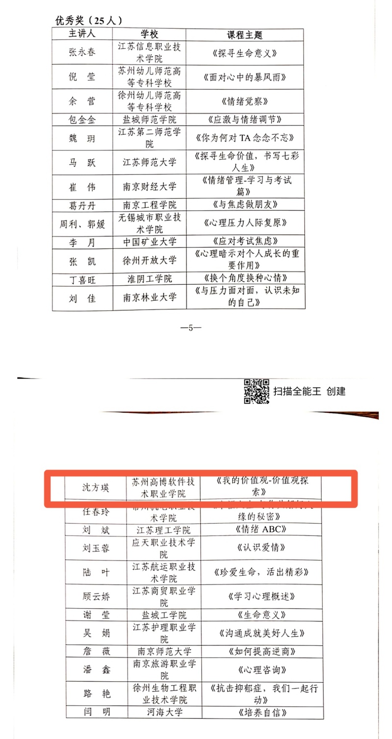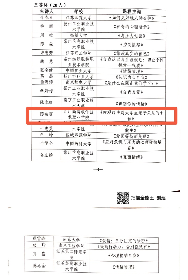 省教育厅《关于公布全省高校大学生心理健康教育“精彩一课”教学微课竞赛结果的通知》(苏心发[2021]5号)文件的表彰名单中,我校两位老师榜上有名,其中陈祎雯老师荣获三等奖、沈方瑛老师荣获优秀奖,这也是我校首次在该竞赛中获奖!