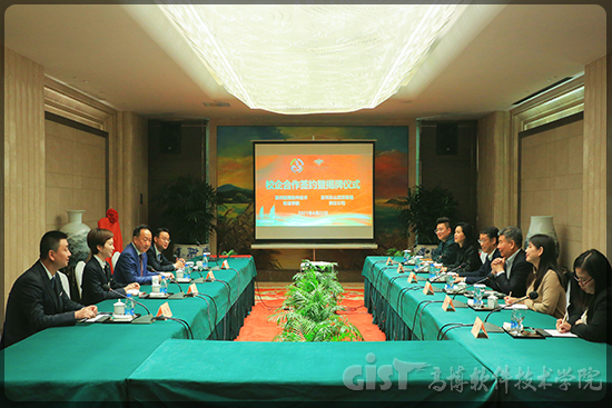 百谷等雨、我在等你。4月22日,在淅沥的谷雨中,苏州高博软件技术职业学院与苏州东山宾馆有限责任公司校企合作签约暨揭牌仪式在会融厅隆重举行。校企双方就“国宾定向班”、“工学结合班”合作事宜达成一致,学校副校长张建初、教务处处长陆霞、国际商学院院长王则斌、校企合作办公室主任马浩等,东山宾馆总经理周苏国、副总经理叶寿康等共同出席此次仪式。张建初副校长、周苏国总经理分别代表校企双方致辞、签约并揭牌。校企双方十年的合作,在此刻深化、升华。