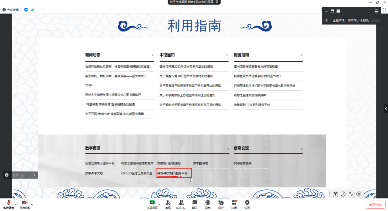 11月10日晚上,2025年图书馆迎新季系列活动之“图书馆资源与服务”主题讲座在腾讯会议举行,本次讲座由马老师主讲。该活动旨在让2025级新生进一步了解图书馆资源、服务项目,提高同学们对文献信息的获取与利用能力。
